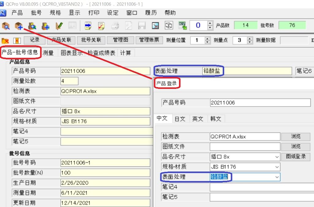 例;在“产品登录”的“表面处理”中选出“铬酸盐”(右下图)和登录的产品-批号信息。